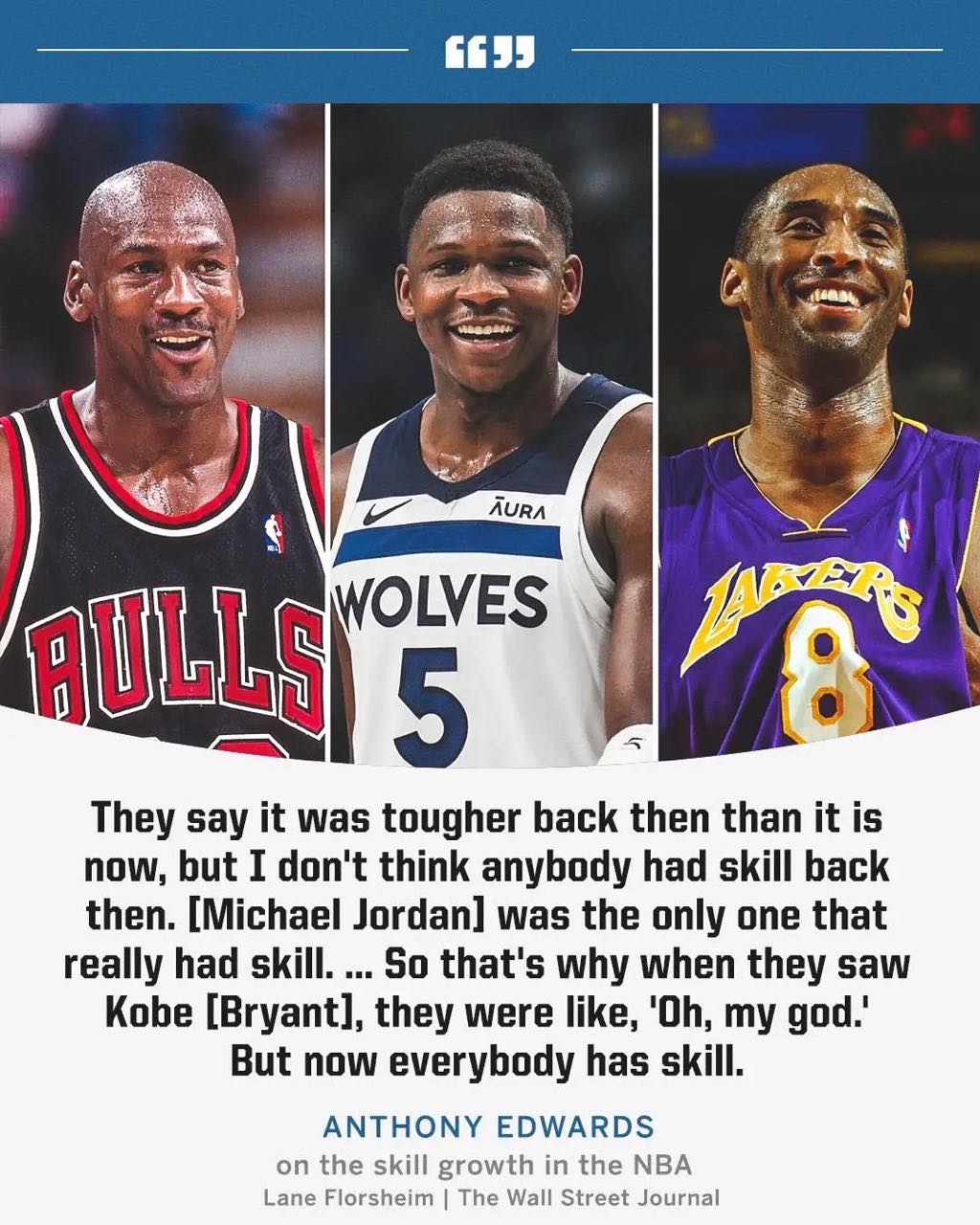 近日,森林狼球星爱德华兹此前在接受采访表示乔丹那个时代的球员没有技术,乔丹是唯一一个真的有技术的球员。
