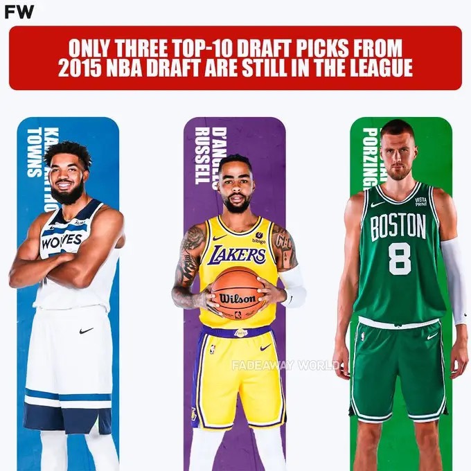 今日,美媒Fadeaway world晒出一张图表示2015届NBA选秀大会前十顺位中仅有三位还在联盟中打球。