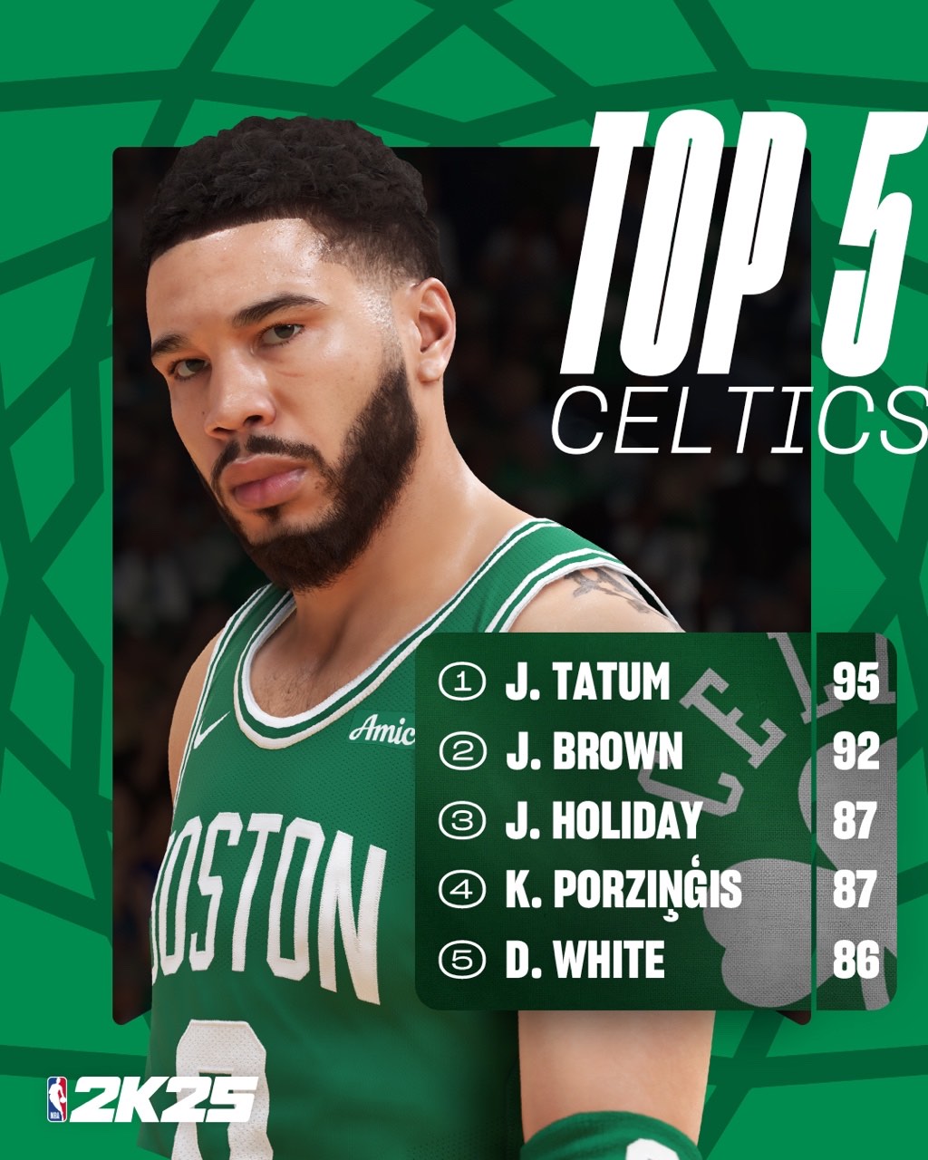 🌟2K晒上赛季NBA冠军凯尔特人评分前五:实力强大 五人均86分以上