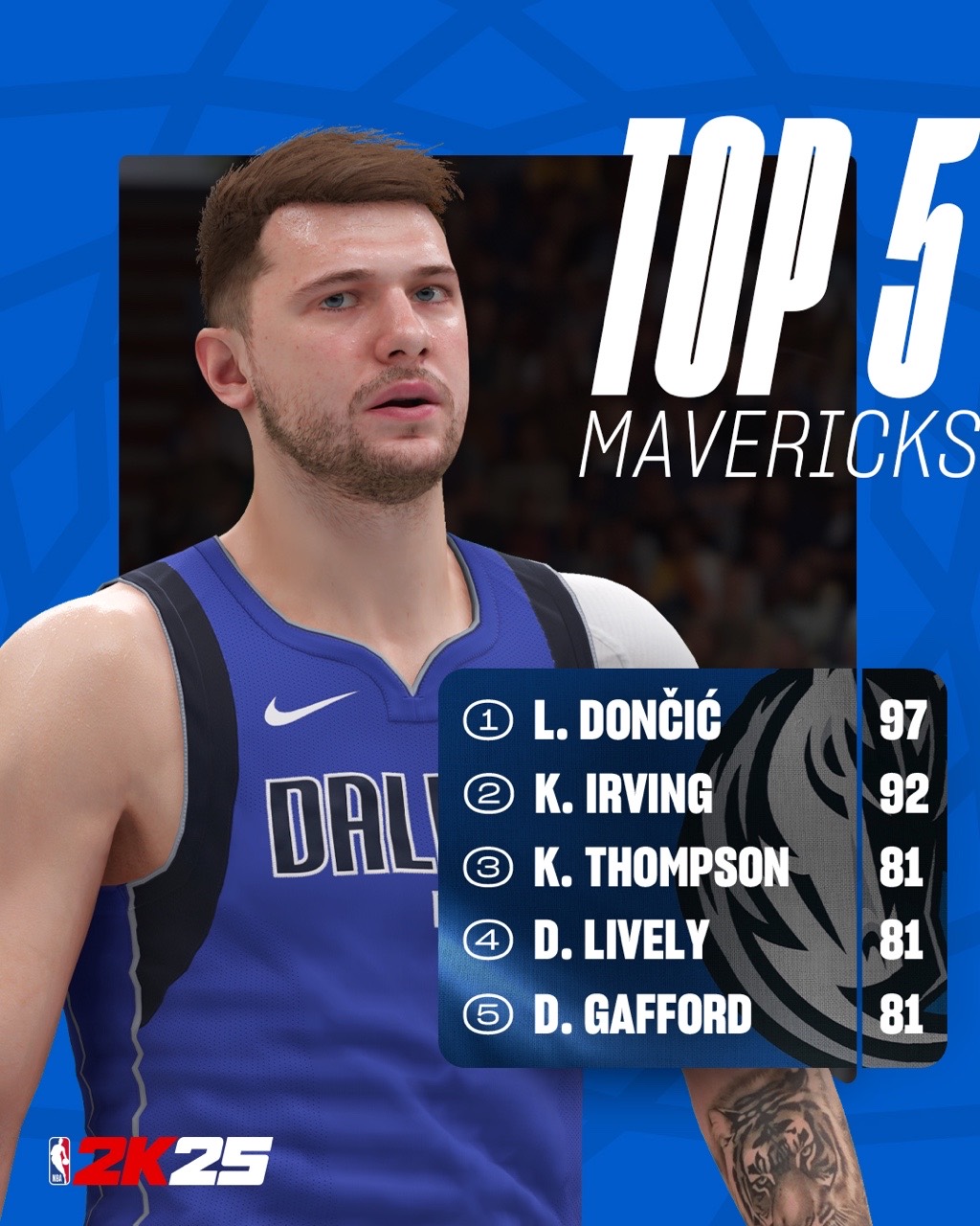 🌟2K晒上赛季NBA西部冠军独行侠2K评分前五球员:东契奇、欧文双90 汤普森跌至81
