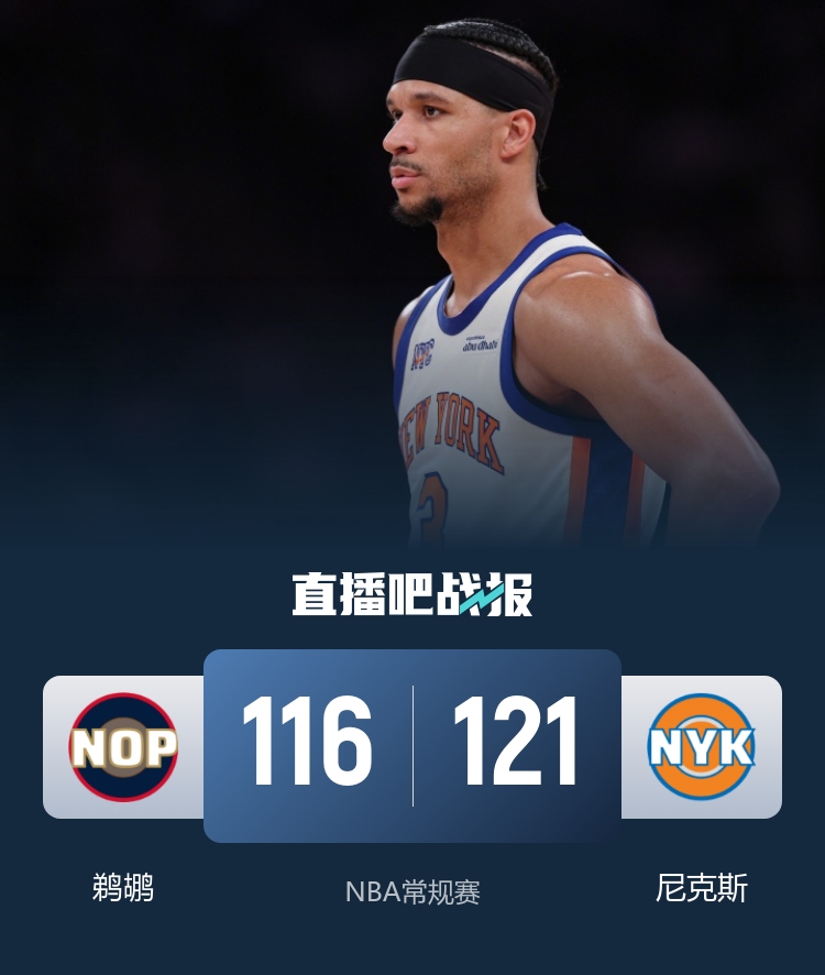 比赛开始,鹈鹕进攻端多点开花打得很主动,布伦森攻传带队咬住比分,双方展开拉锯战,最后3分钟尼克斯轰出15-0领先到14分,次节尼克斯断电4分钟仅得2分,鹈鹕18-2攻击波一度反超,随后尼克斯接连外线回应,半场尼克斯守住5分领先。下半场,鹈鹕上来再次追平比分,尼克斯连续三分止血,鹈鹕全民皆兵再回应,双方又展开胶着拉锯战,三节尼克斯仅领先1分,末节双方比分还是拉不开,布伦森连续取分帮助尼克斯领先两球以上,最后时刻“点球大战”,德章泰·穆雷三分不中,最终尼克斯121-116力克鹈鹕。