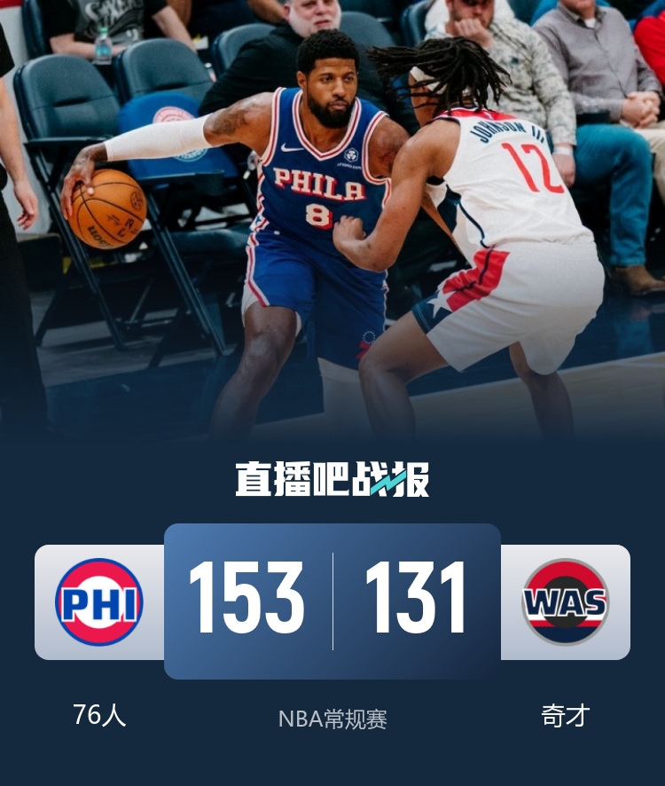 一开场,乔治率先发力,连投带罚率队很快取得两位数领先,奇才内外开花奋力追赶,次节马克西开始发力,频频冲击内线得手,但奇才火力更猛,多点开花逐渐占据场上主动,乔治挺身而出连中三分,半场战罢76人73-71领先奇才。下半场,76人攻防两端压制对手,轰出24-6的进攻狂潮将分差拉开到20分以上,吉尔弹无虚发苦苦支撑,保罗·乔治内外开花,76人越战越勇扩大优势,奇才苦苦追赶无果。最终,76人153-131大胜奇才,客场过关。