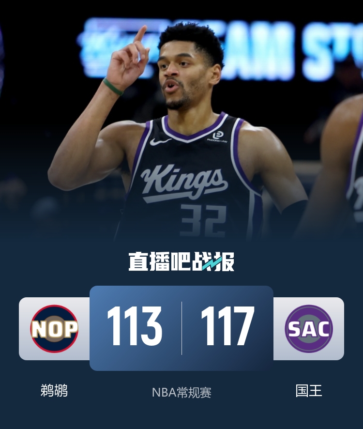 此役一上来鹈鹕先声夺人,锡安连造杀伤,费尔斯和墨菲续上火力,国王新秀雷诺发挥亮眼但并不解渴,首节结束时鹈鹕领先9分,次节回来,雷诺延续火力对飚费尔斯,两队拉开架势火热对攻,半场战罢,鹈鹕保持11分优势。短暂休整后克利福德手感滚烫连中三分,国王多点开花蚕食分差,三节结束后鹈鹕依然领先7分,末节上来,国王一鼓作气一举反超,决胜时刻雷诺两罚一中,锡安绝平上篮遭大帽,鹈鹕追分未果,最终国王117-113逆转鹈鹕送对手7连败。