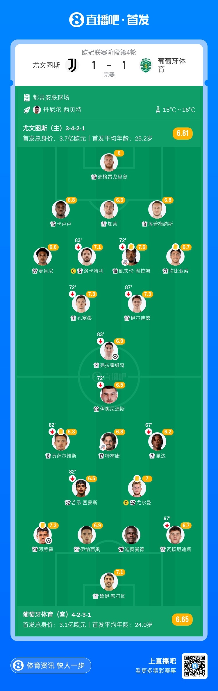 11月5日讯 欧冠联赛阶段第4轮,尤文图斯坐镇主场都灵安联球场迎战葡萄牙体育。上半场,M-阿劳霍先拔头筹,特林康中框,弗拉霍维奇破门。易边再战,瓦扬尼迪斯失良机。最终尤文1-1葡萄牙体育。积分榜方面,尤文四轮仅3分,葡体7分。