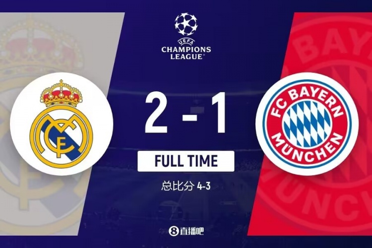 下半场补时9分钟。最终全场比赛结束,皇马2-1拜仁。