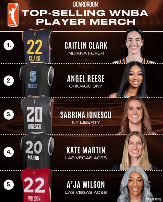今日,国外知名体育媒体@Boardroom公布了WNBA球衣销量排行榜。