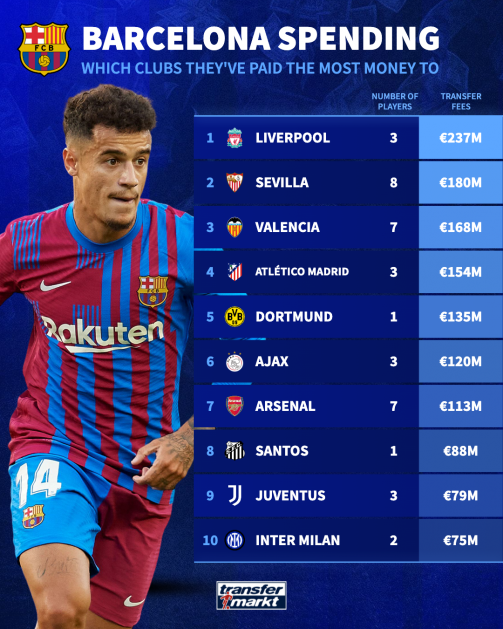 阿森纳以1.13亿欧元排名第7,合计7笔引援,代表球员是亨利、法布雷加斯、宋等球员。桑托斯以8800万欧元排名第8,只有内马尔这一笔引援。尤文图斯以7900万欧元排名第9,合计3笔引援,代表球员是价值6000万欧元的皮亚尼奇。国际米兰以7500万欧元排名第10,合计两笔引援,代表人物是价值6900万欧元的伊布。