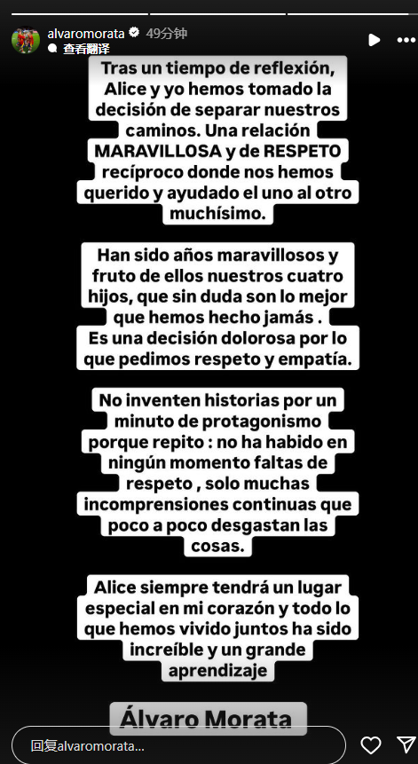 莫拉塔写道:“这是一个痛苦的决定,希望大家能有基本的尊重和同理心,不要信口开河地造谣,我们之间从来没有缺乏尊重,只有很多的误解,这些误解消磨了我们的感情。爱丽切在我心中永远有特殊的位置,我们一起经历的一切都令人难以置信。”