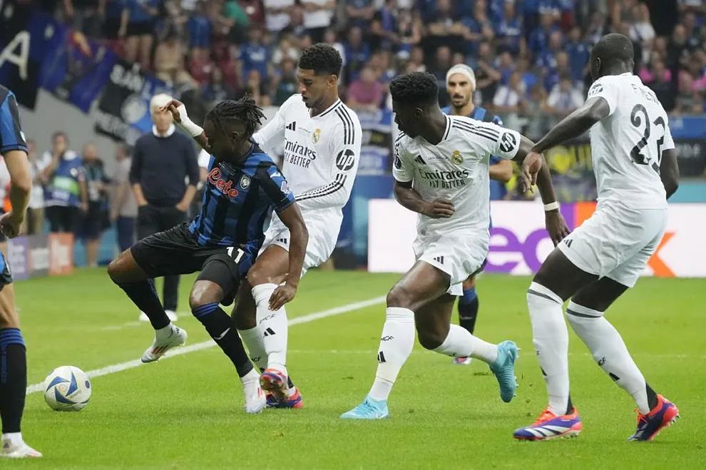 楚阿梅尼的低迷表现迫使皇马让巴尔韦德和贝林厄姆更多地参与进攻组织,边后卫及罗德里戈和维尼修斯也不得不加入其中。亚特兰大的人盯人战术限制了皇马三叉戟的发挥,尽管维尼修斯表现出色,多次为贝林厄姆和罗德里戈创造良机,成为场上最耀眼的明星,但皇马在长时间内都无法转化为进球。
