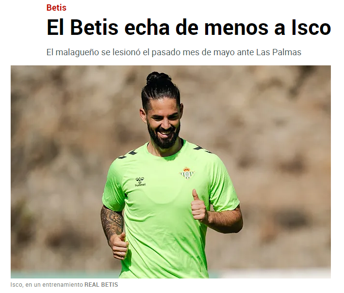 而在伊斯科缺席期间,皇家贝蒂斯上赛季最后3轮2平1负,战平了拉斯帕尔马斯和皇马,0-2不敌皇家社会,本赛季的首轮又战平吉罗纳无缘开门红。