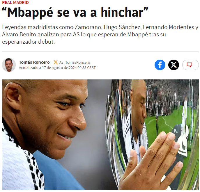 而西班牙媒体《阿斯报》则引用了几位前皇马球员对姆巴佩的首秀评价,智利射手萨莫拉诺表示,“我认为姆巴佩会打进很多球,我很高兴看到他来到皇家马德里并穿着9号战袍,这是我一生挚爱的俱乐部。我很荣幸能成为俱乐部历史射手之一,就像本泽马或C罗一样。毫无疑问,姆巴佩将继续书写属于他的历史。他在进球方面有特殊的天赋,在一个赛季中可以完美地打入50球,他的首秀令人兴奋。”
