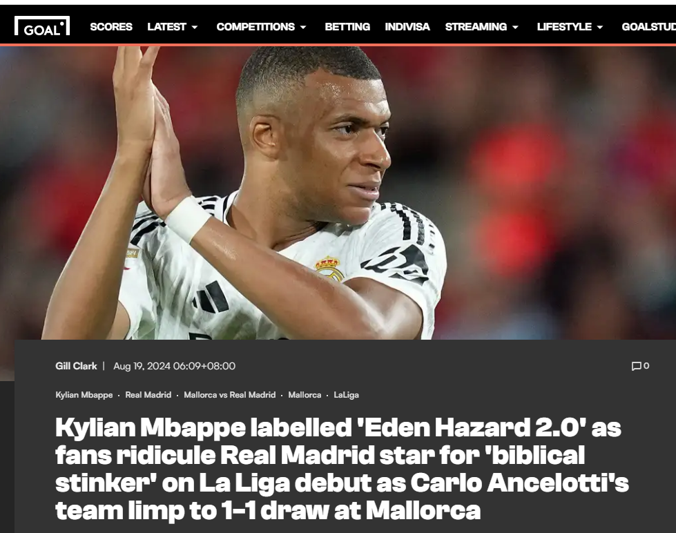 北京时间8月19日,西甲首轮,皇马以1-1战平马洛卡,没能获得开门红。赛后,皇马球迷大肆批评姆巴佩,甚至将他称之为“阿扎尔2.0版”。