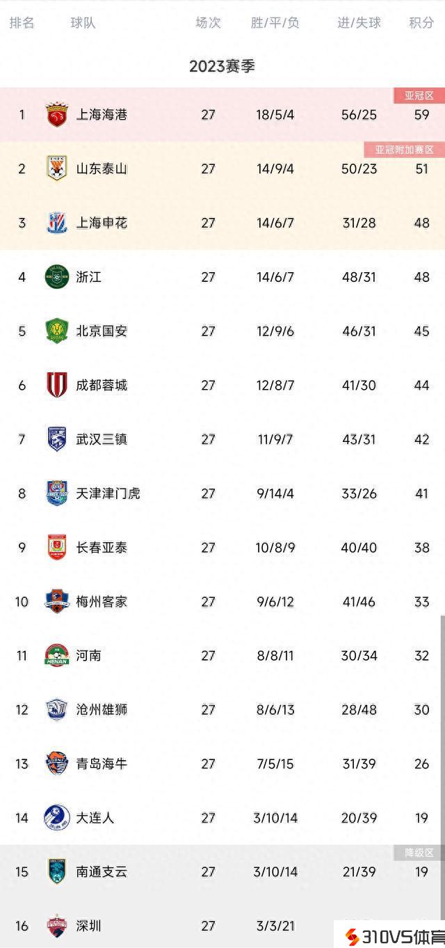 剩3轮!中超积分榜:泰山、申花等7队争亚冠名额,大连&南通其一升级