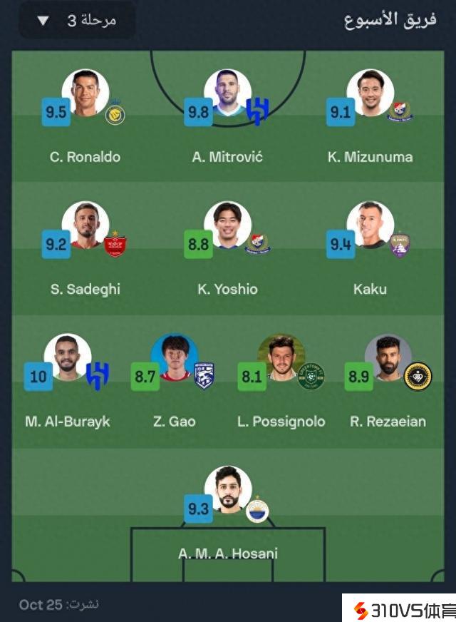 SofaScore亚冠小组赛第三轮最佳阵:C罗领衔,高准翼、卢卡斯中选