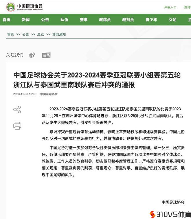 浙江队与泰国武里南联队亚冠赛后发作抵触,中国足协通报
