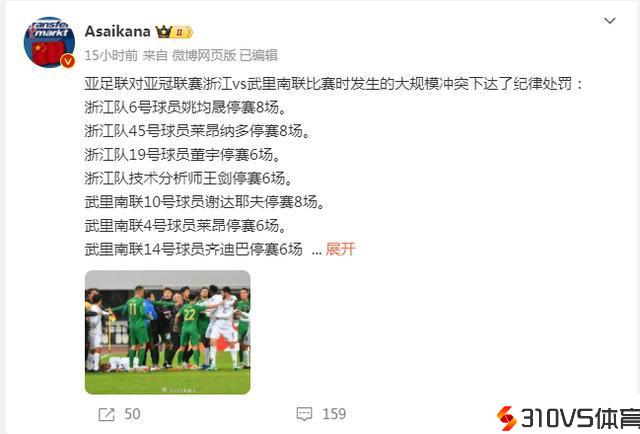距离亚冠最后一场竞赛还有2天时间,亚足联终于官宣最新决议,11日,亚足联官方发布对武里南和浙江队抵触的处分。武里南3名球员被禁赛:詹姆斯和齐迪巴各禁赛6场、谢伊达耶夫禁赛8场,此外武里南联还被罚款1万美元。而浙江队姚均晟和莱昂纳多各禁赛8场、董宇禁赛6场、技术剖析师王剑禁赛6场,浙江被罚款1万美元。