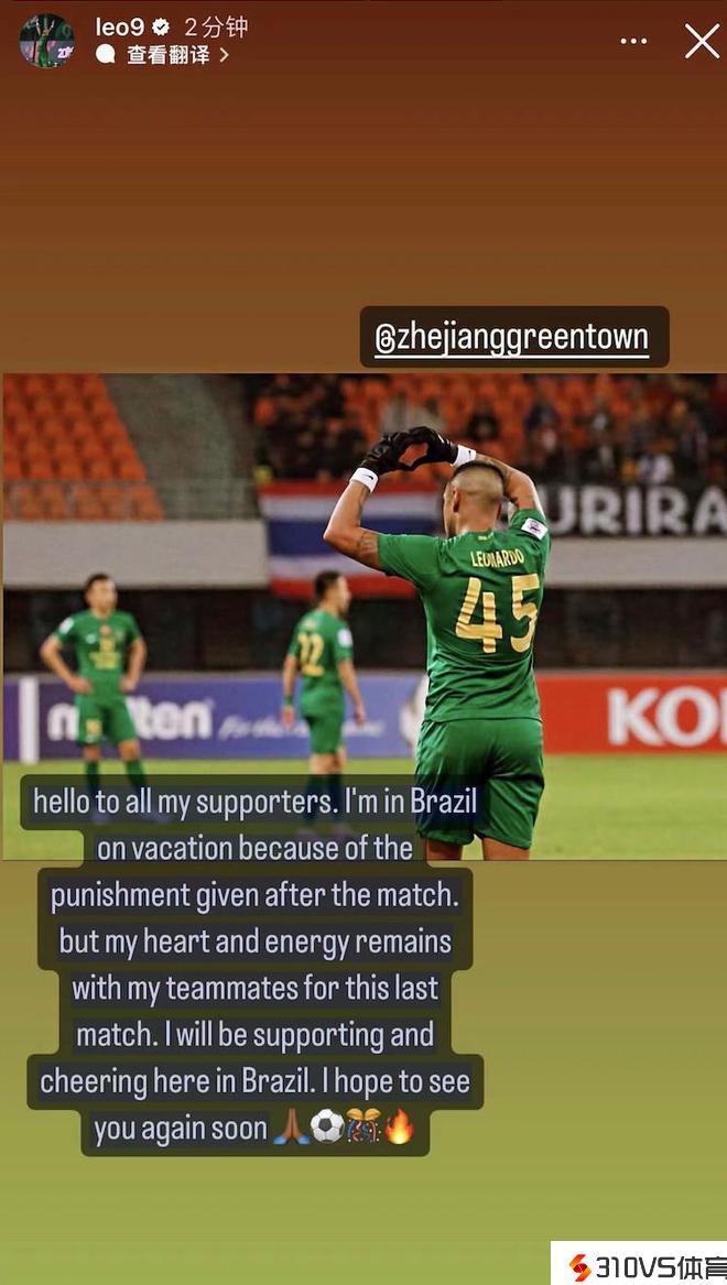 浙江队莱昂纳多:我目前在巴西度假,但我的心仍与队友们同在