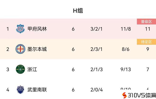 亚冠H组:J2球队甲府风林头名出线,浙江7分第三武里南6分垫底