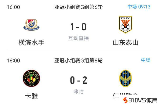亚冠G组同时开打,半场泰山0-1落后,仁川联抢先。在实时积分上,泰山、横滨、仁川联3队同积12分。