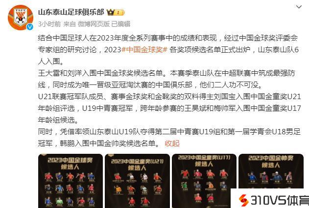 年末岁尾也到了足坛各大奖项的评选时间,21日,经过中国金球奖评委会专家组的研讨讨论,2023中国金球奖各奖项候选名单正式出炉,山东泰山队6人入围。区分是王大雷和刘洋入围中国金球奖候选名单。U21联赛冠军队成员刘国宝入围U21年龄组评选,U19中青赛冠军成员王昊斌和梅帅军入围U17年龄组候选。往年连夺两项冠军的U19主帅韩鹏入围中国金帅奖候选名单。