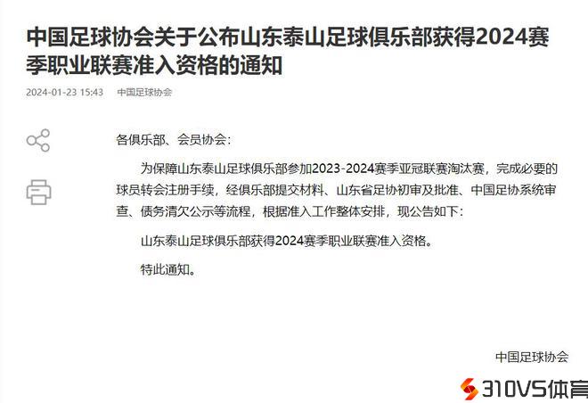 足协公示山东泰山经过准入 保证亚冠淘汰赛球员注册