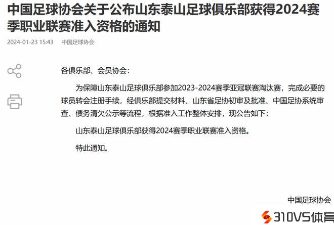足协官宣:为保证亚冠赛事,泰山队获新赛季准入资历