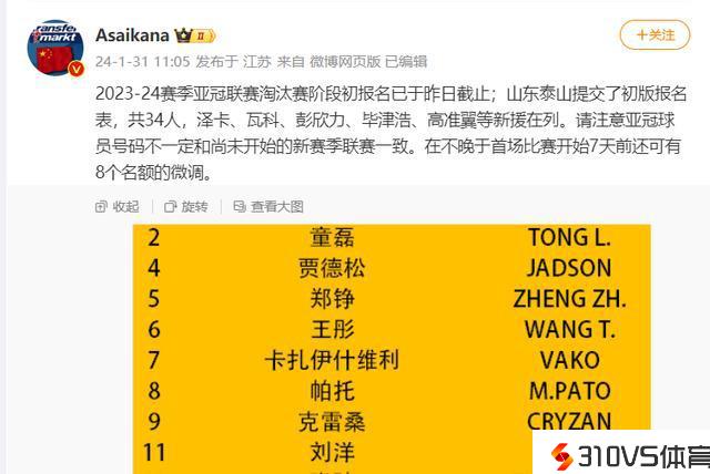 亚冠竞赛即未来临,泰山队大名单也引人关注,31日上午,德转网正式官宣,泰山队34人大名单,此次大名单新援均在列,号码也发布。据德转网泄漏2023-24赛季亚冠联赛淘汰赛阶段初报名已于30日截止;山东泰山提交了初版报名表,共34人,泽卡、瓦科、彭欣力、毕津浩、高准翼等新援在列。请留意亚冠球员号码不一定和尚未末尾的新赛季联赛分歧。