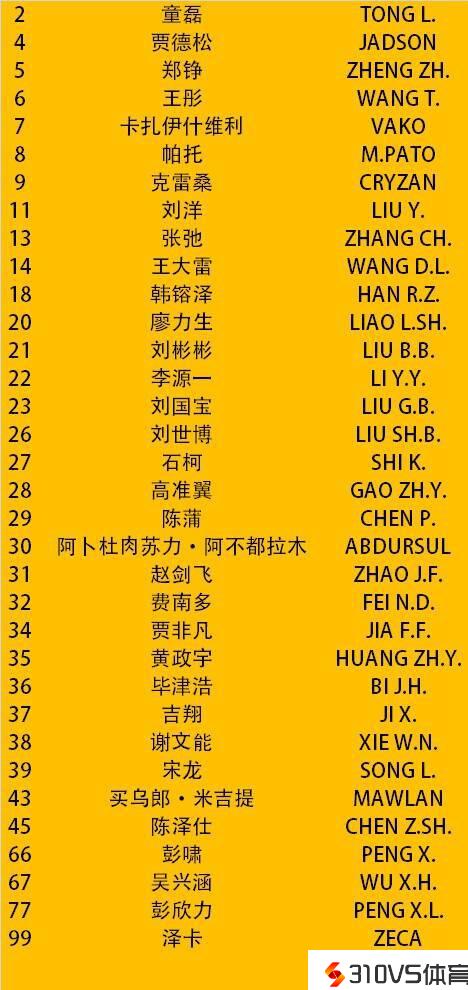 童磊、贾德松、郑铮、王彤、卡扎伊什维利、帕托、克雷桑、刘洋、张弛、王大雷、韩镕泽、廖力生、刘彬彬、李源一、刘国宝、刘世博、石柯、高准翼、陈蒲、阿卜杜肉苏力·阿不都拉木、赵剑非、费南多、贾特殊、黄政宇、毕津浩、吉翔、谢文能、宋龙、买吾郎·米吉提、陈泽仕、彭啸、吴兴涵、彭欣力、泽卡