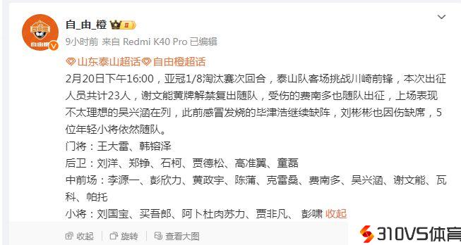 门将:王大雷、韩镕泽。后卫:刘洋、郑铮、石柯、贾德松、高准翼、童磊。中前场:李源一、彭欣力、黄政宇、陈蒲、克雷桑、费南多、吴兴涵、谢文能、瓦科、帕托。小将:刘国宝、买吾郎、阿卜杜肉苏力、贾特殊、彭啸。在近期备受关注的竞赛中,泰山队面临着主力缺阵的困境。令人遗憾的是,刘彬彬、毕津浩、吉翔、宋龙、张弛和泽卡等6位中心球员因各种缘由无法上场,这对泰山队来说无疑是一次庞大的应战。但是,在这困难时辰,小摩托费南多的回归为泰山队带来了一线生机。
