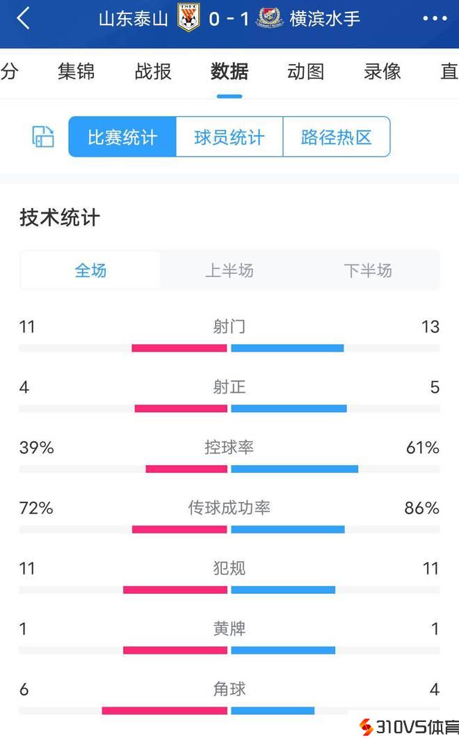 小组赛泰山两战横滨数据:首战控球率接近四六开,次战三七开