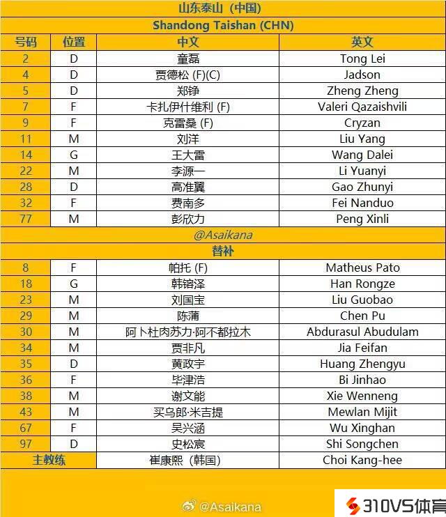 山东泰山首发:14-王大雷、2-童磊、4-贾德松(F)、5-郑铮、28-高准翼、11-刘洋、22-李源一、77-彭欣力、7-卡扎伊什维利(F)、9-克雷桑(F)、32-费南多