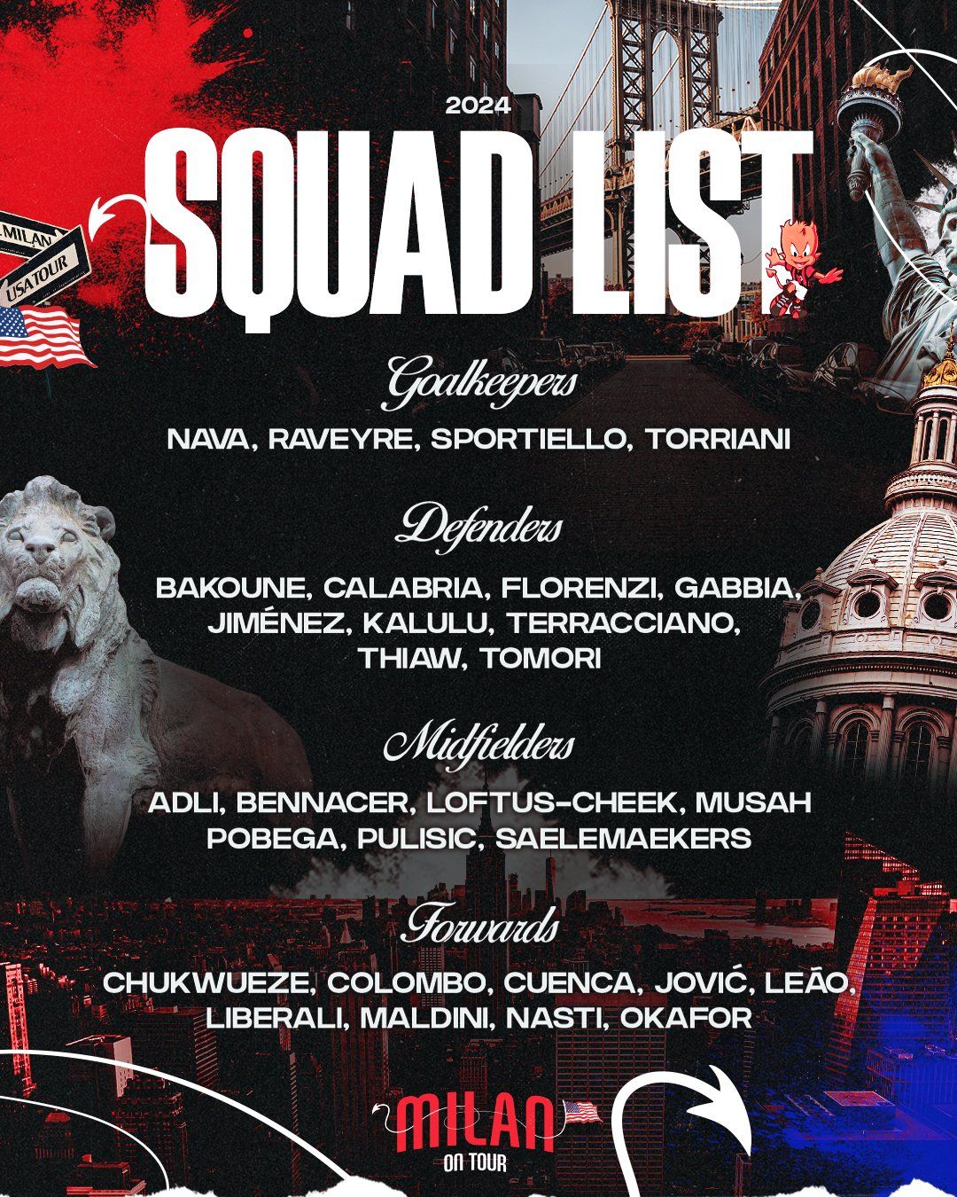 AC米兰公布美国行大名单:莱奥、普利希奇领衔 迈尼昂、莫拉塔缺席