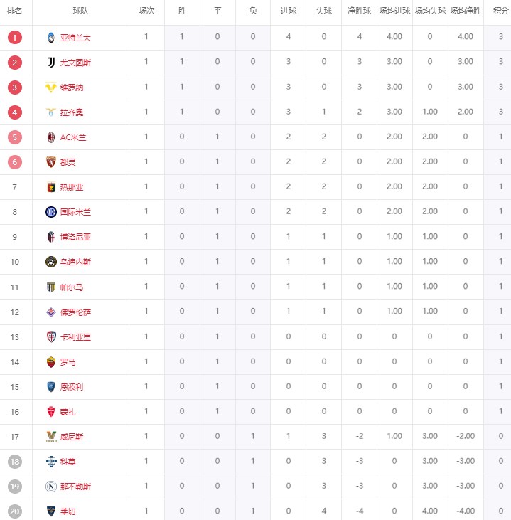 意甲首轮收官:尤文亚特兰大取开门红 米兰双雄均不胜那不勒斯惨败