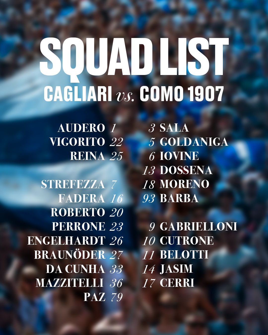 科莫公布战卡利亚里大名单:新援帕斯、佩隆均入选