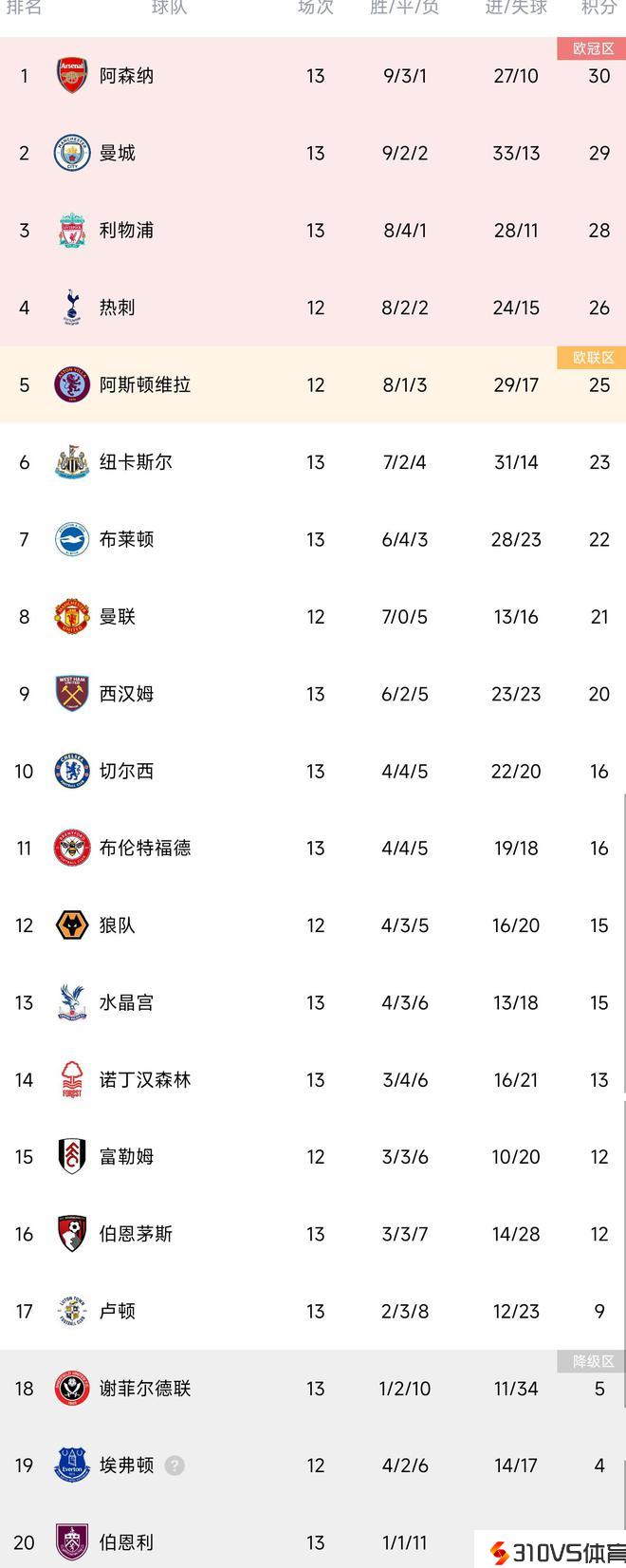 争冠白热化英超积分榜:阿森纳绝杀登顶,曼城利物浦排名二三