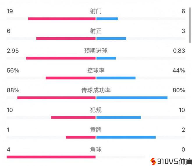 阿森纳2-1狼队全场数据:预期进球值2.95-0.83,射门19-6