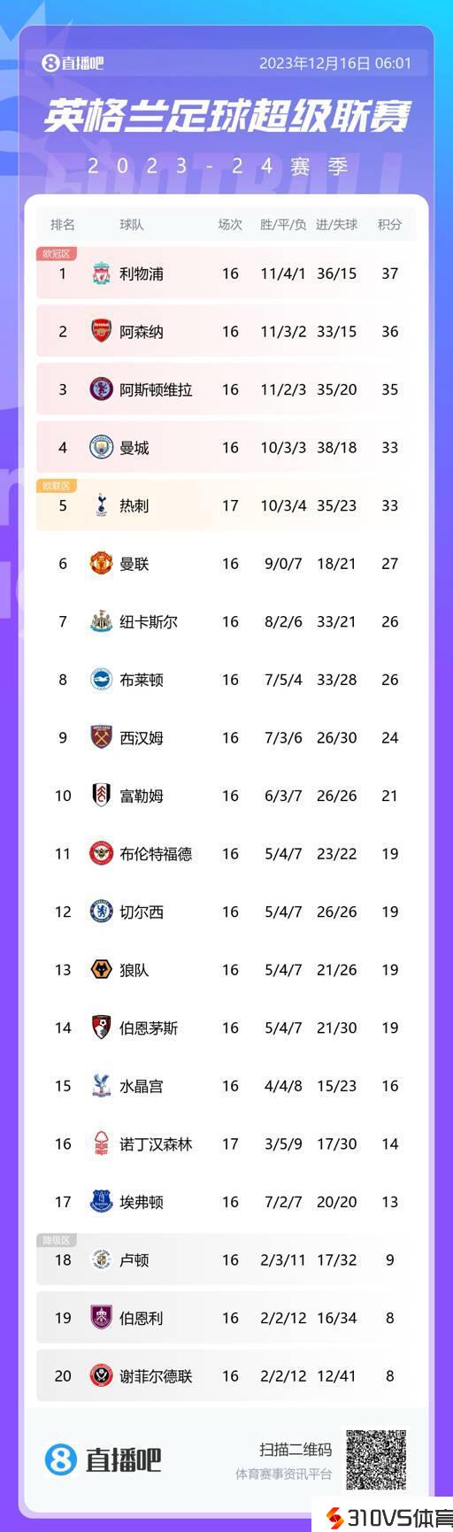英超积分榜:热刺先赛赢球仍第五,与第四曼城同分