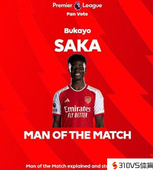 还击破门,英超官方:萨卡中选阿森纳2-1诺丁汉森林全场最佳