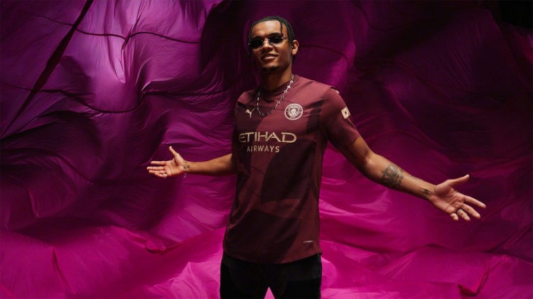 曼城发布了2024-2025赛季的第二客场球衣,该款球衣主色调为勃艮第色(酒红色),队徽、赞助商等标志为金色,曼城队徽的船型图案覆盖在球衣上。