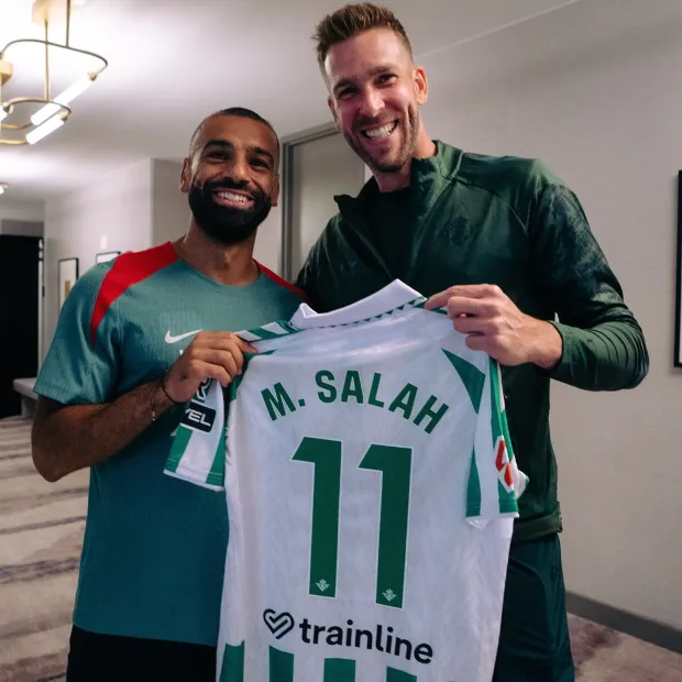 阿德里安曾经效力利物浦5年,他与萨拉赫的关系也是非常好,在比赛前夕,他送给萨拉赫一件印有萨拉赫号码和名字的皇家贝蒂斯球衣,双方还进行了合影。有意思的是,皇家贝蒂斯俱乐部官方社媒发布了这张照片,并且还配文写道:“看看这是啥?”
