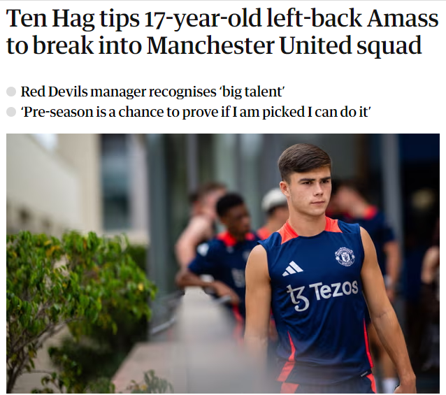 在曼联的季前赛中,滕哈赫出人意料地让17岁的小将哈里·阿马斯出战,