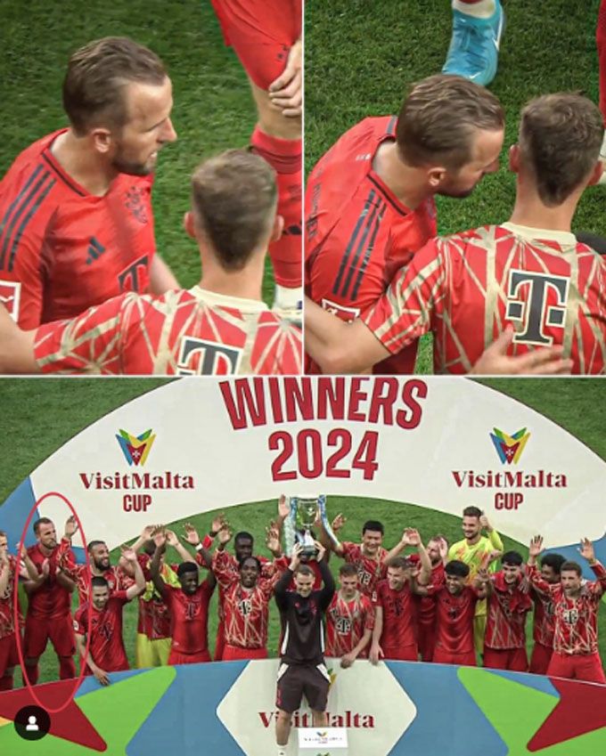 凯恩将举起奖杯的机会让给了队友基米希,自己则选择站在一旁。