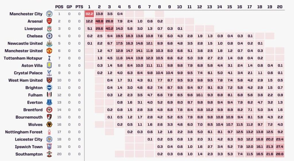 北京时间8月17日凌晨03:00,2024/25赛季的英超联赛将重新开幕,揭幕战由曼联主场对阵富勒姆。外国数据媒体根据超级计算机预测了新赛季英超的冠军归属以及各队的排名。