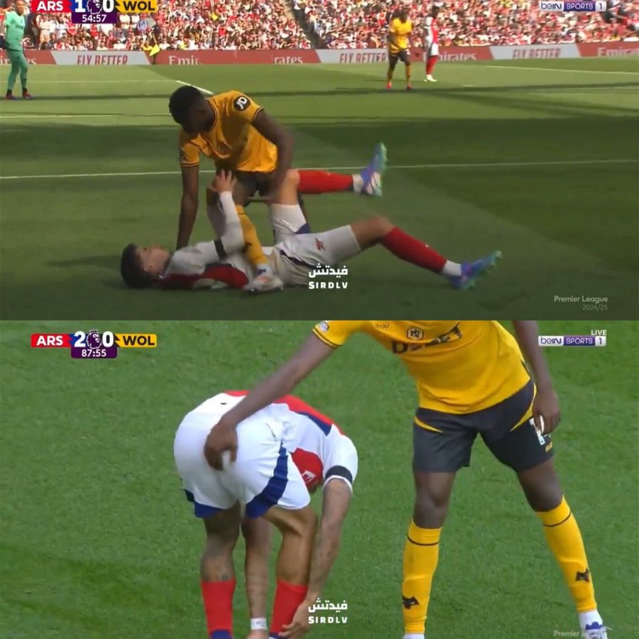 在第55分钟时,莫斯克拉与哈弗茨发生肢体接触,前者倒地前直接锁喉哈弗茨,主裁并为对此有所表示。第88分钟,替补上场的热苏斯在俯身系鞋带时,莫斯克拉上前直接“袭臀”热苏斯,后者瞬间暴怒将莫斯克拉推倒在地,主裁随即向热苏斯出示了一张黄牌。