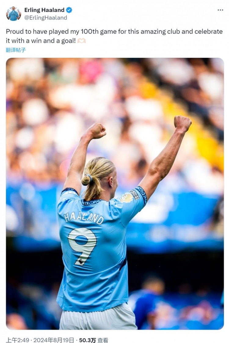 值得一提的是,本场比赛是哈兰德为曼城第100次出战,赛后,哈兰德也在社交媒体上晒出庆祝的照片,并写道:“我很自豪能为这家了不起的俱乐部出战第100场比赛,并用一场胜利和一个进球来庆祝。”