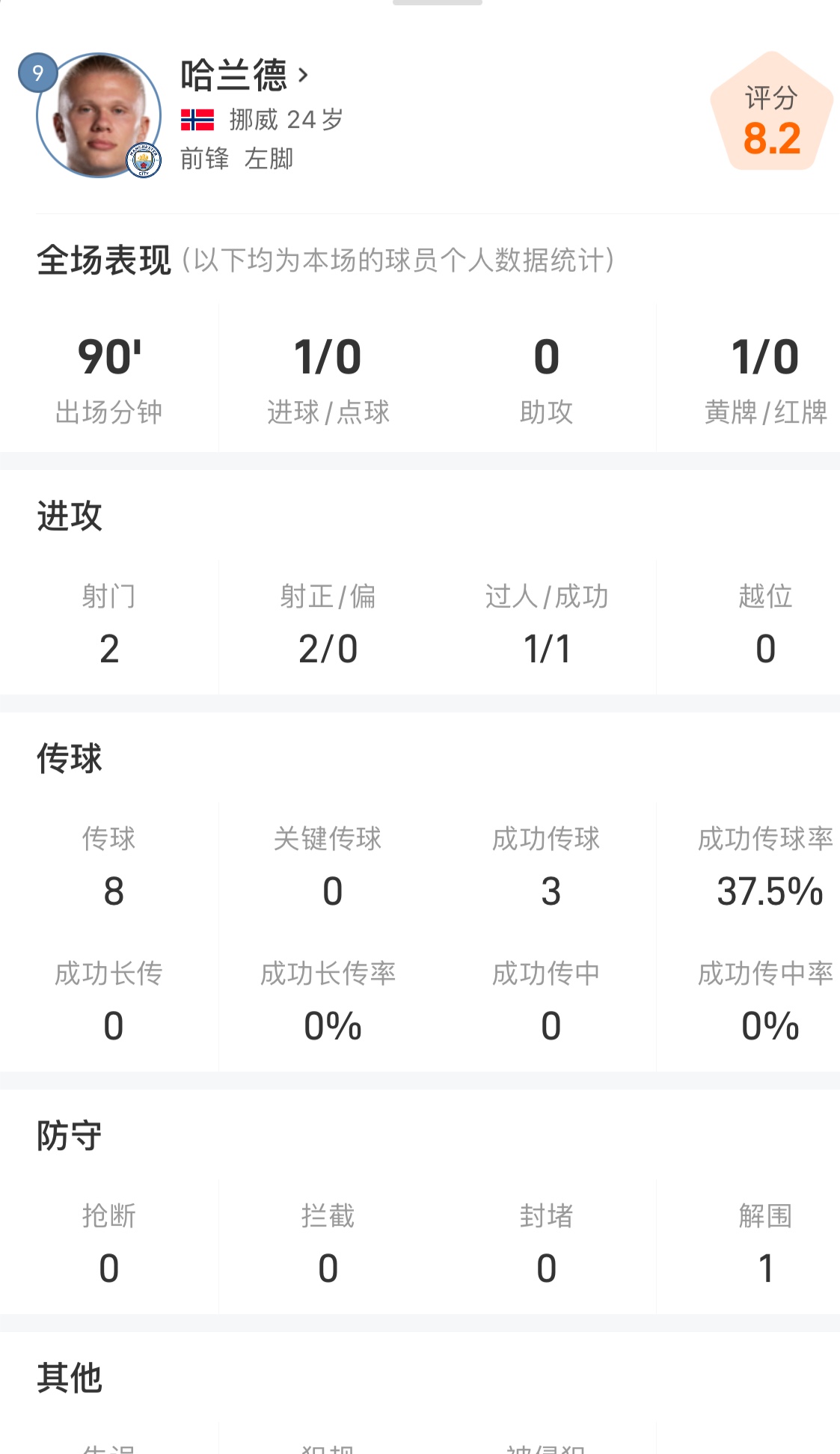 根据数据显示,哈兰德打满全场,共触球17次,尝试8次传球,仅有3次成功传球,这也是瓜迪奥拉执教麾下首位完成这项数据的球员。