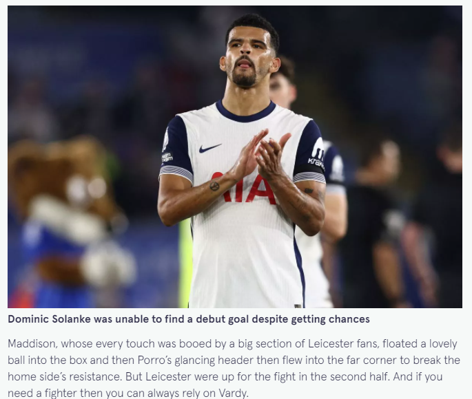 英媒:索兰克首秀被瓦尔迪狠狠教训 热刺葬送好局自吞苦果