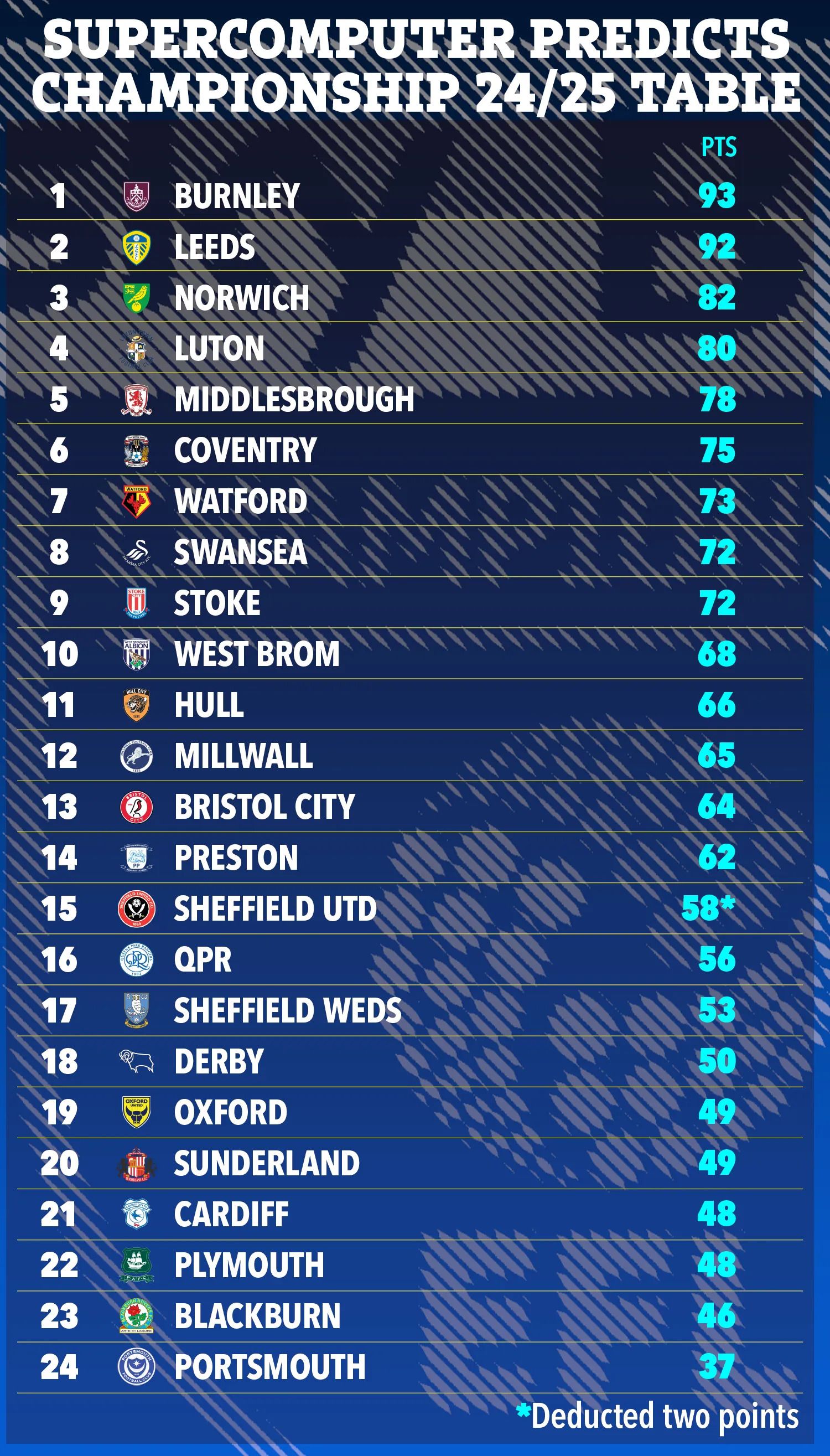 据《太阳报》消息,超级计算机给出新赛季英冠的最终排名预测,结果显示伯恩利与利兹联将直通英超,鲁尼带队的普利茅斯最终会回到英甲。