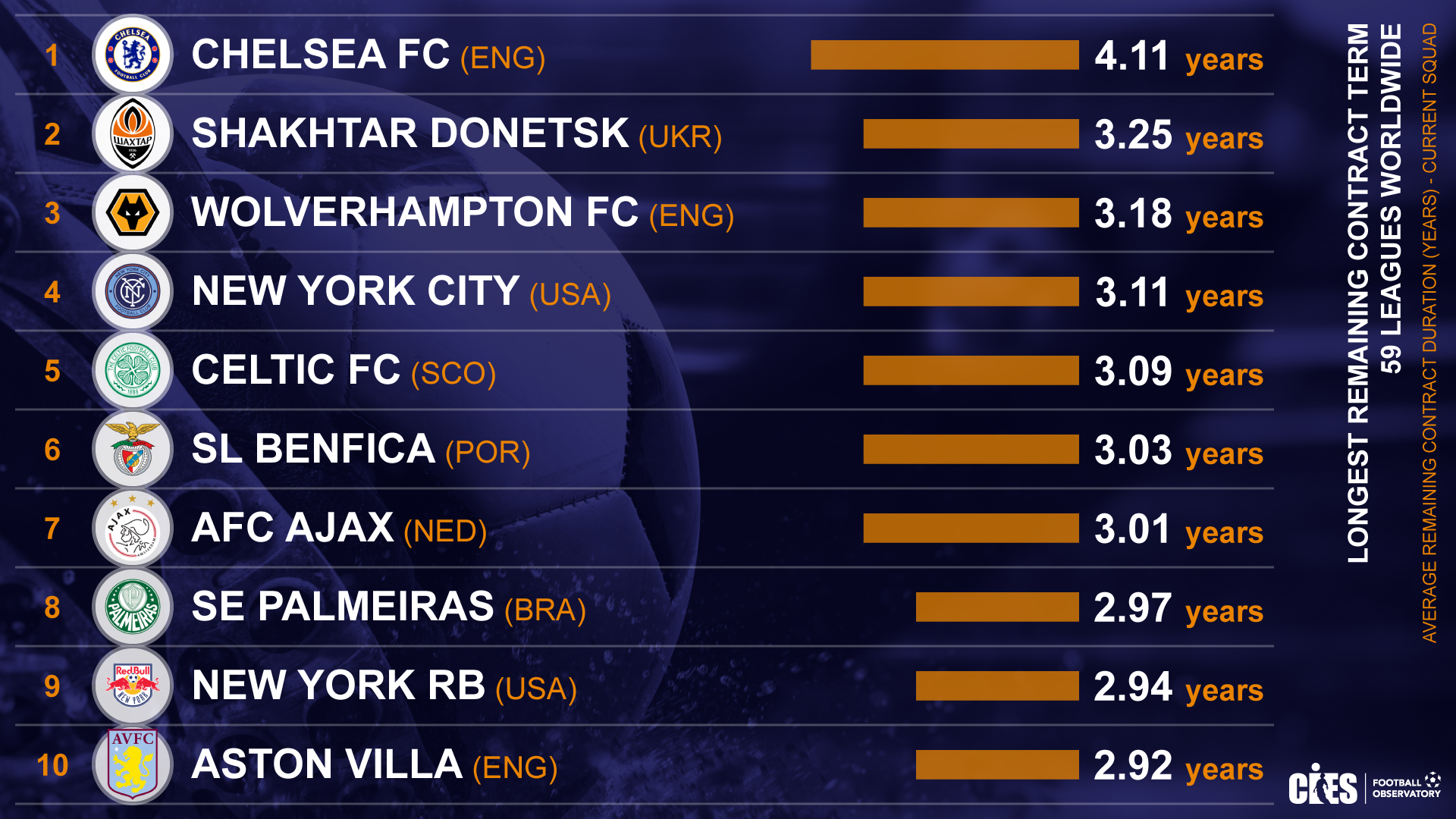 天空体育:切尔西一线队合同总年数合计191年 平均每人4.11年 位居世界59大联赛榜首