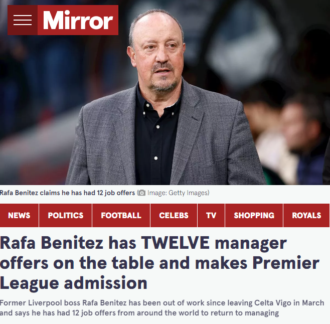 根据英国媒体《邮报》的报道,贝尼特斯在接受采访时透露,自己收到了12份执教邀请,此前还有英超中下游球队对他有意,但他还在考虑中,一旦决定重新出山肯定是要重返英超。